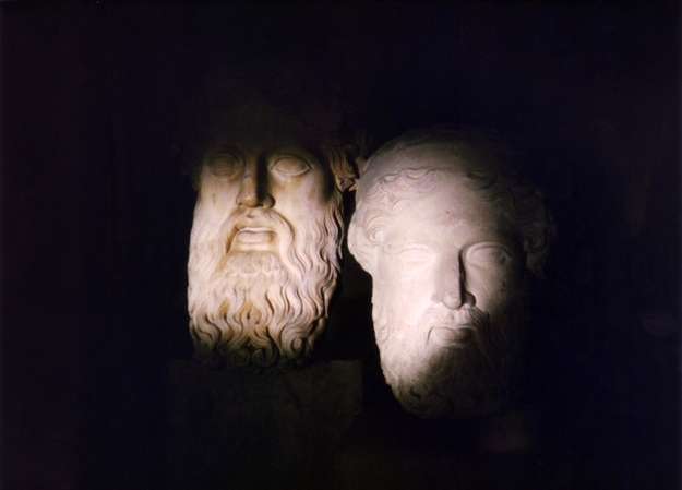 Snapshot of sunlit Greek busts inside the Musee du Louvre, Paris, France