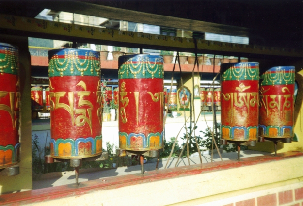 Prayer wheels encircling an outdoor Buddhist shrine on the main street in Dharamsala, Himachel Pradesh, India